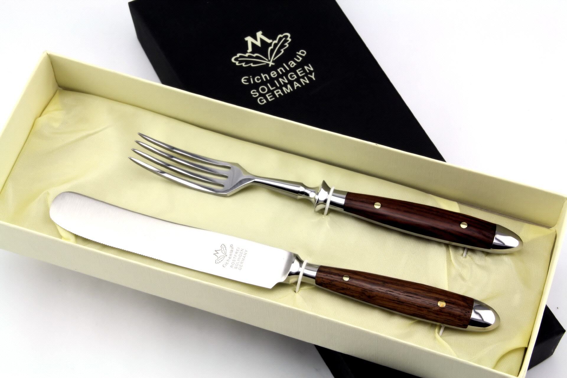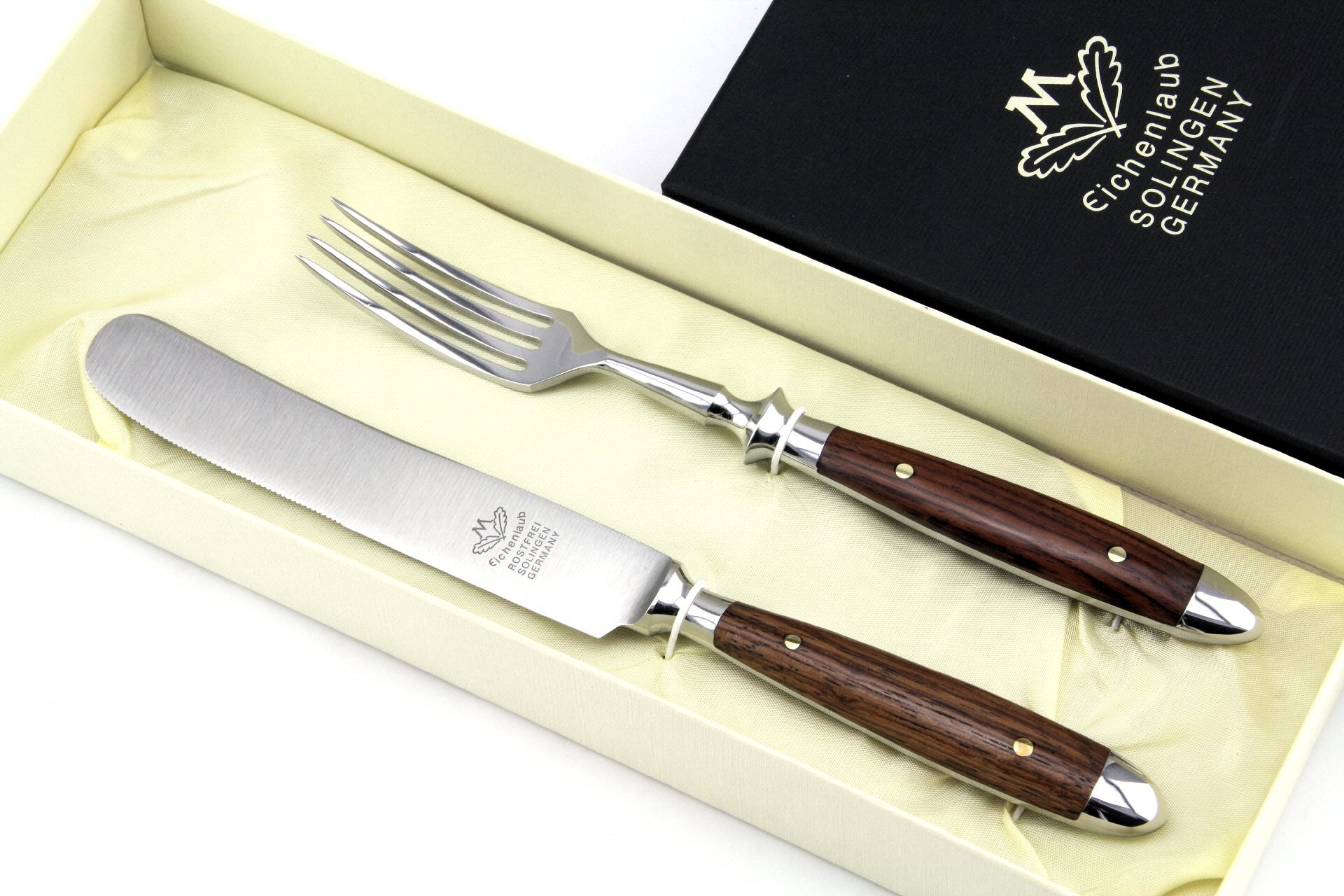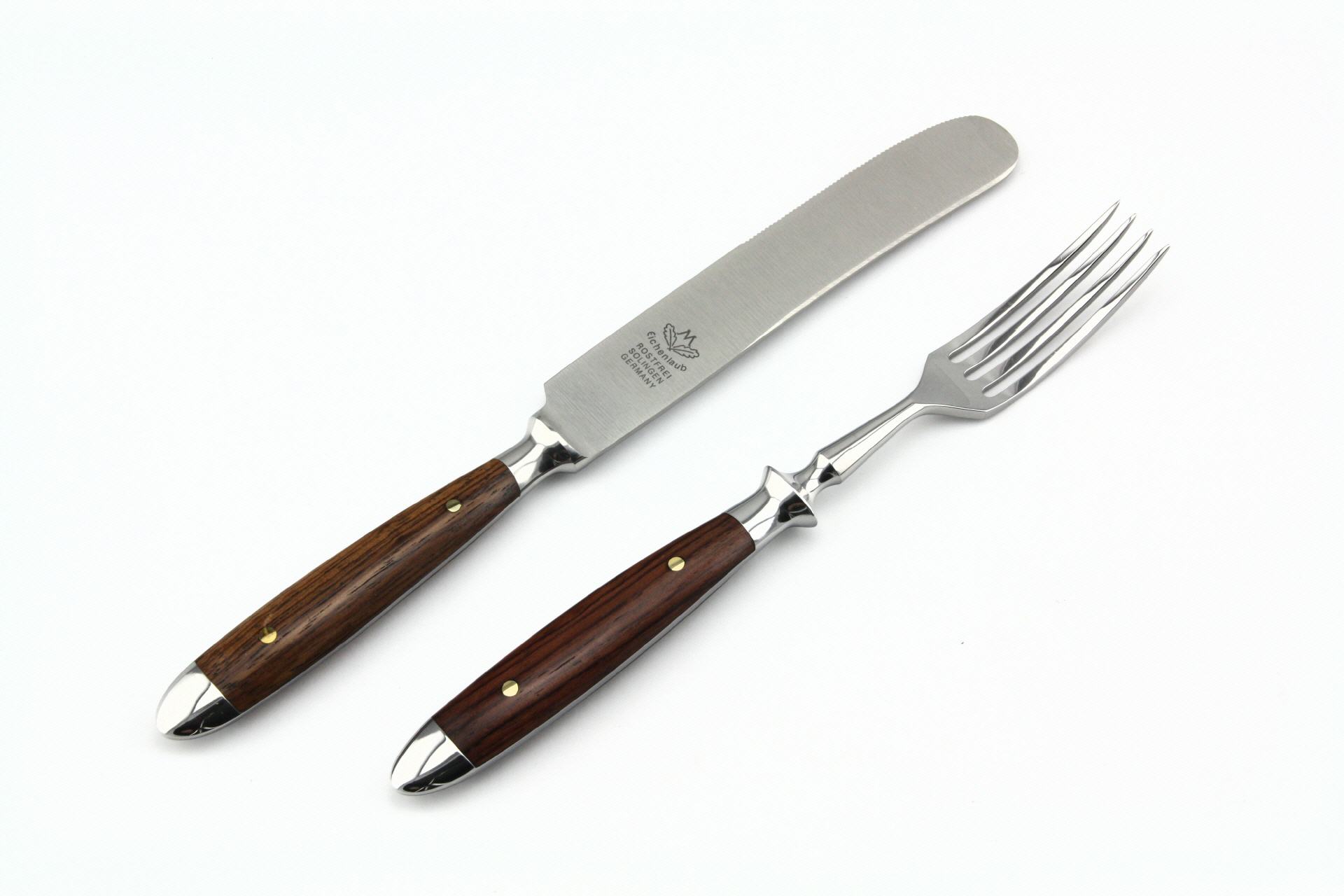 Angefangen vom Schmieden bis zum letzten Poliervorgang durchläuft ein Eichenlaub-Besteckteil gut 122 Arbeitsschritte. Nach dem Gesenkschmieden, Stanzen und Härten werden die Rohlinge geschliffen, feingeschliffen, poliert und für die Griffmontage vorbereitet. Die Griffschalen werden mit Messingnieten fest mit dem Erl verbunden. Die Oberflächen der Klingen sind sorgsam "blaugepließtet" und die Schneiden mit einer feinen Säge versehen.