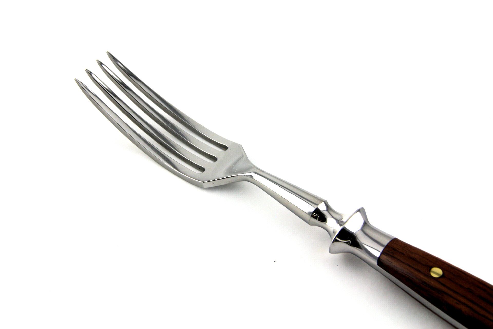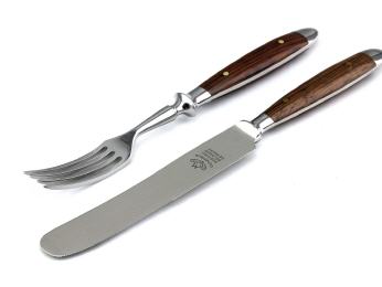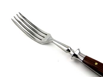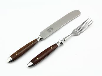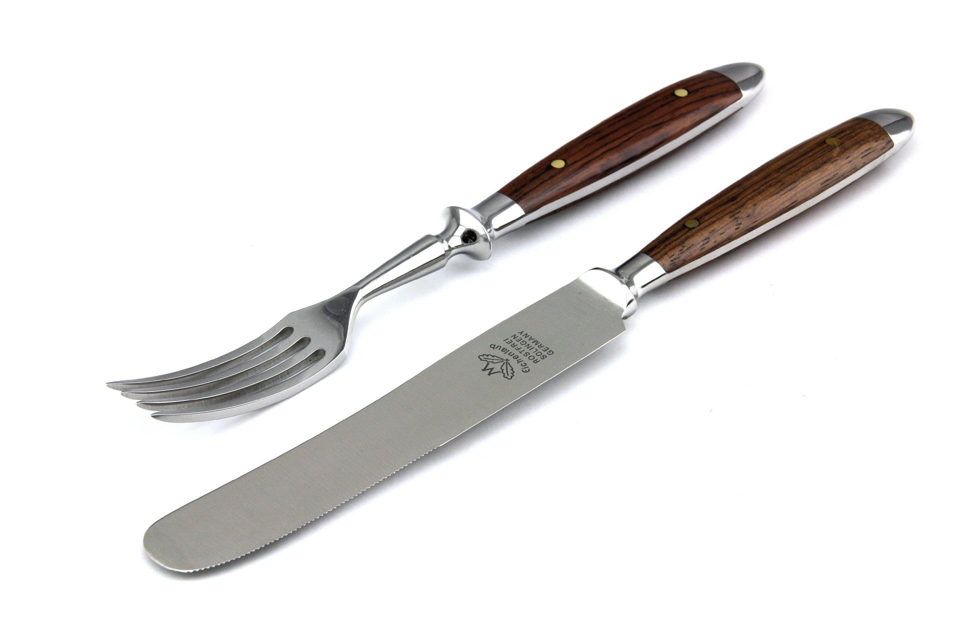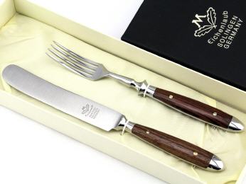 Die Messer des "Backen'-Schmiedebestecks bestehen aus rostfreiem Chrom- Molybdän-Vanadium-Stahl, also echtem schmiedbaren Material. In der Fachbezeichnung wird er "1,4116" genannt. Alle anderen Teile werden aus rostfreiem Chromstahl geschmiedet. Die Fachbezeichnung für dieses Material lautet "1,4021".