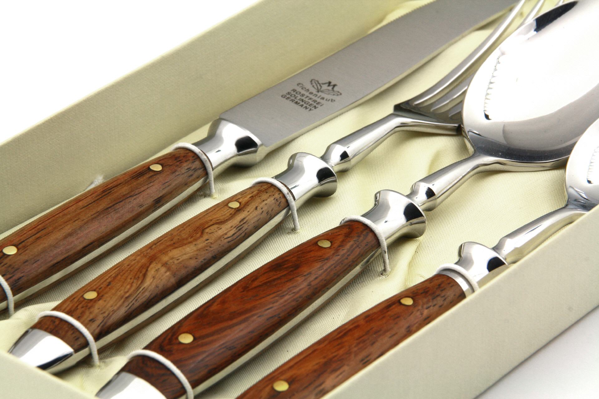 Die Messer des "Backen'-Schmiedebestecks bestehen aus rostfreiem Chrom- Molybdän-Vanadium-Stahl, also echtem schmiedbaren Material. In der Fachbezeichnung wird er "1,4116" genannt. Alle anderen Teile werden aus rostfreiem Chromstahl geschmiedet. Die Fachbezeichnung für dieses Material lautet "1,4021".