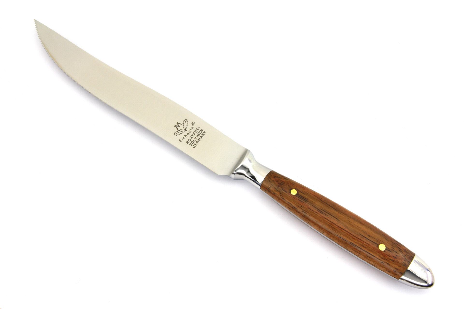 Das rückenspitze Steakmesser, unverkennbar mit der zum Klingenrücken zeigenden Spitze. Stabil und mit scharfer Säge versehen ist es zugeschnitten für Fleischgerichte aller Art.