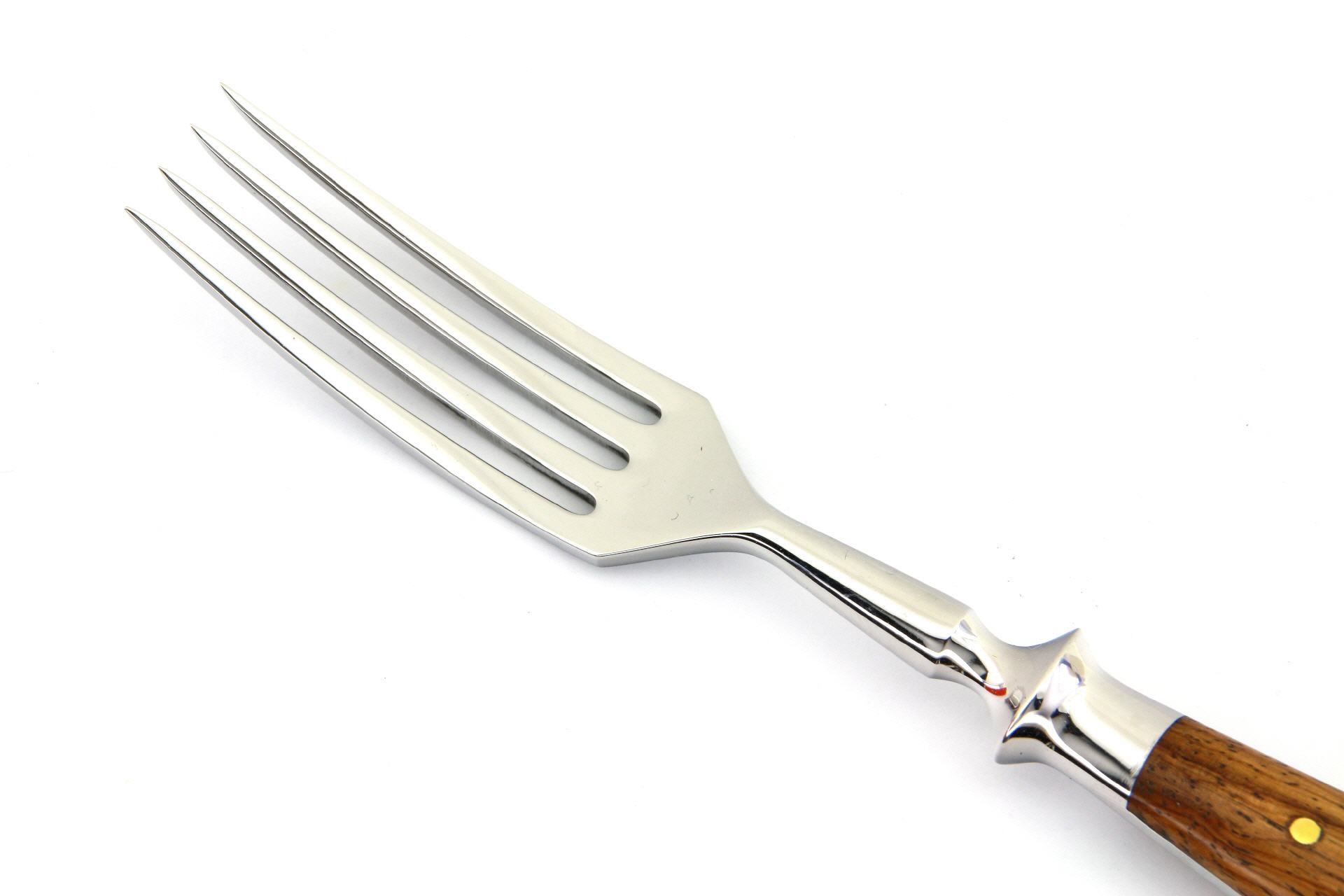 Die Messer des "Backen'-Schmiedebestecks bestehen aus rostfreiem Chrom- Molybdän-Vanadium-Stahl, also echtem schmiedbaren Material. In der Fachbezeichnung wird er "1,4116" genannt. Alle anderen Teile werden aus rostfreiem Chromstahl geschmiedet. Die Fachbezeichnung für dieses Material lautet "1,4021".