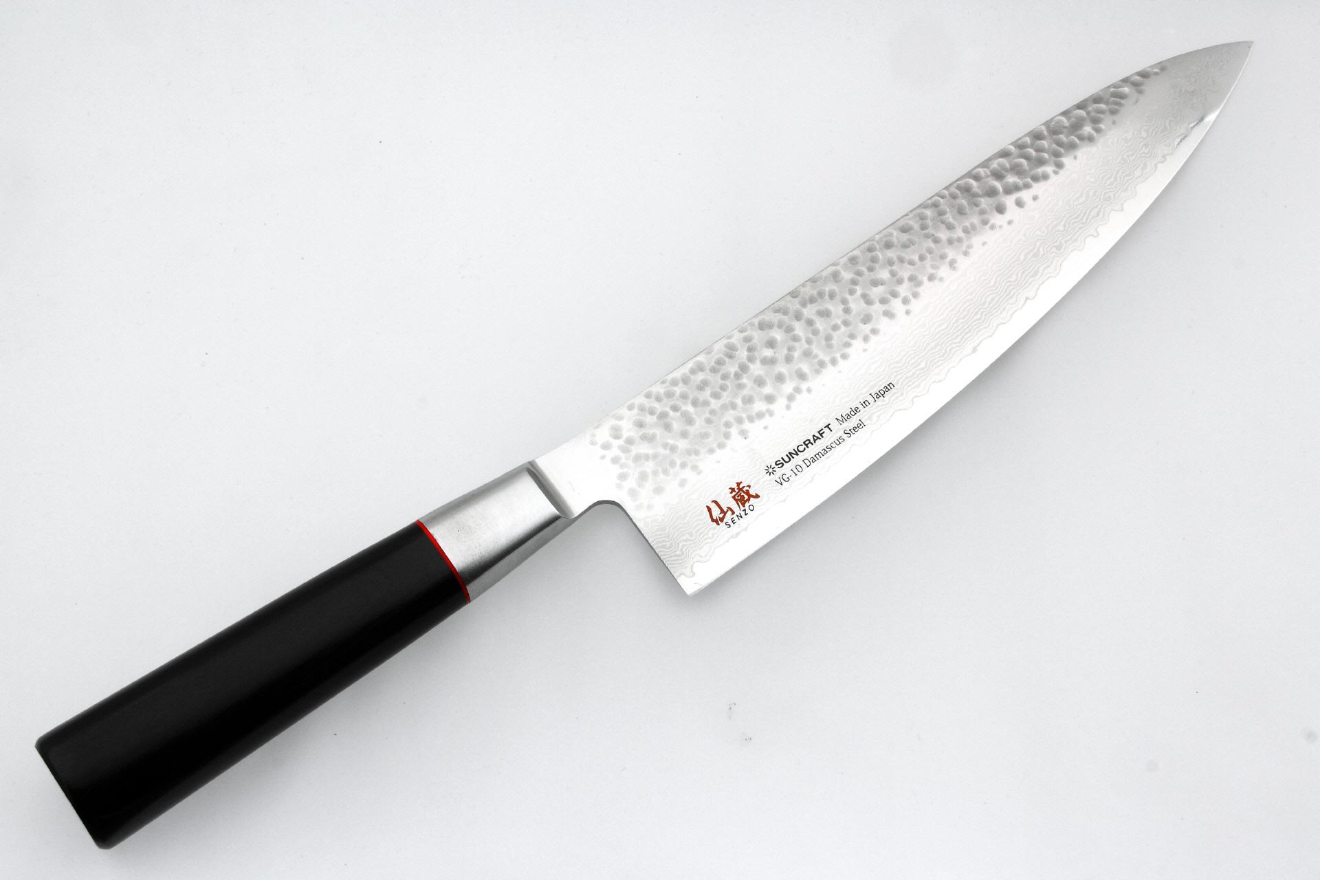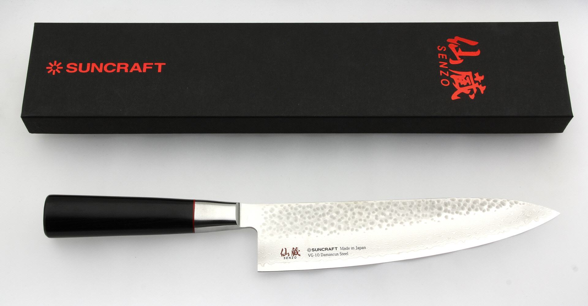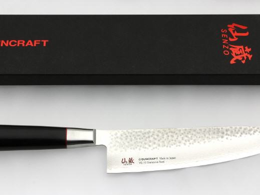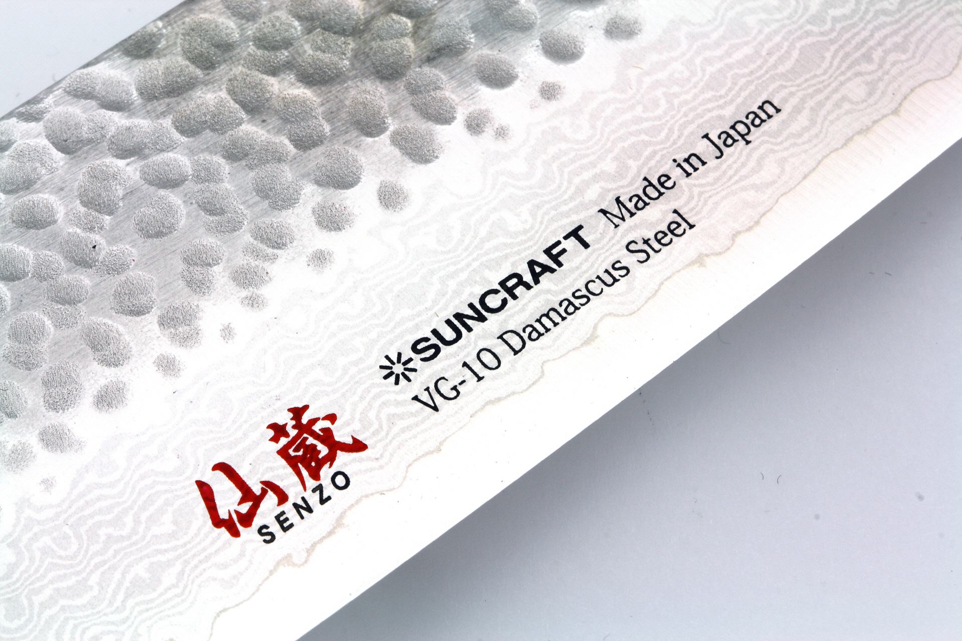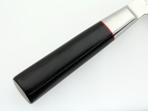Die Klinge besteht aus 33 Lagen rostfreiem Damaststahl. Die Kernlage ist aus VG10 Stahl mit einer Rockwellhärte von 60-61°. Auf beiden Seiten wird sie geschützt von einer Lage Nickel und Silber. Zusätzlich sind je 15 Lagen Damaststahl aufgeschmiedet. Die so aufgebaute Klinge bietet eine höchstmögliche Schnitthaltigkeit bei gleichzeitig größtmöglicher Flexibilität. Die perfekte Hochglanzpolitur, sowie ein Griffstück aus schwarzem Pakkaholz, welches durch seine Kastanienform ergonomisch in der Hand liegt, runden dieses Meisterstück optimal ab.