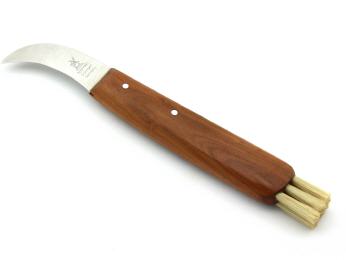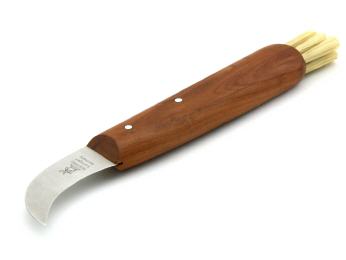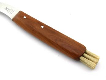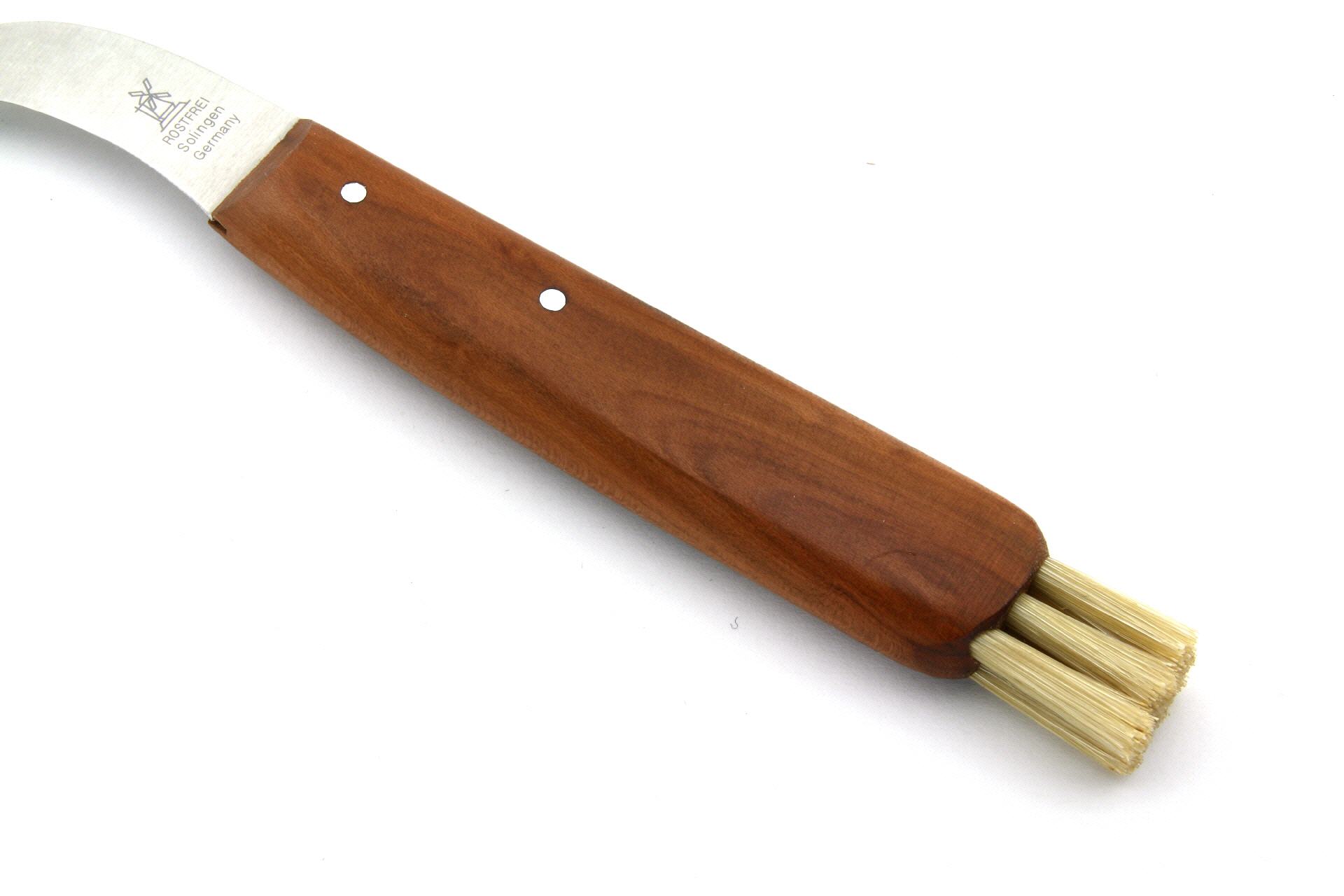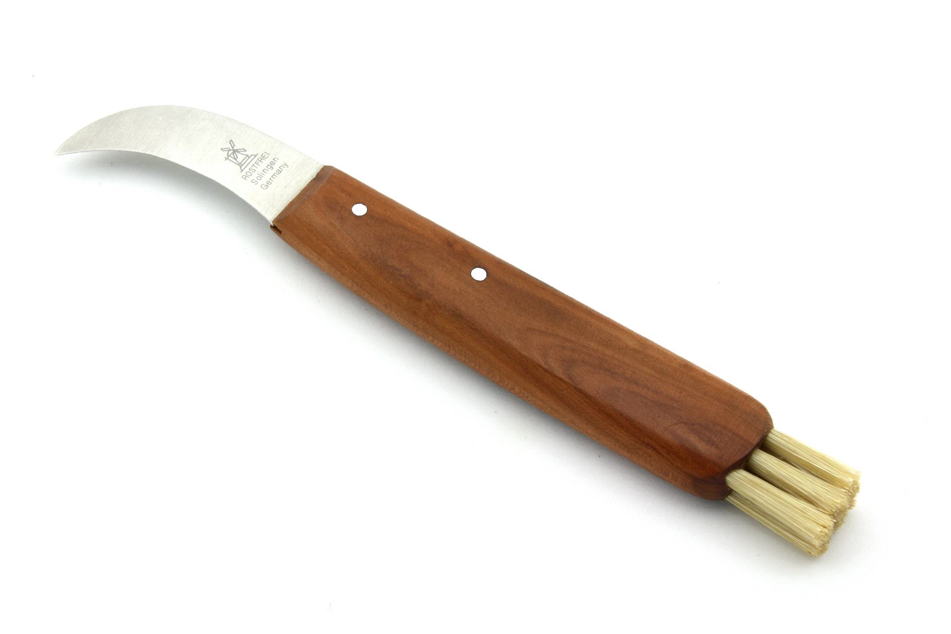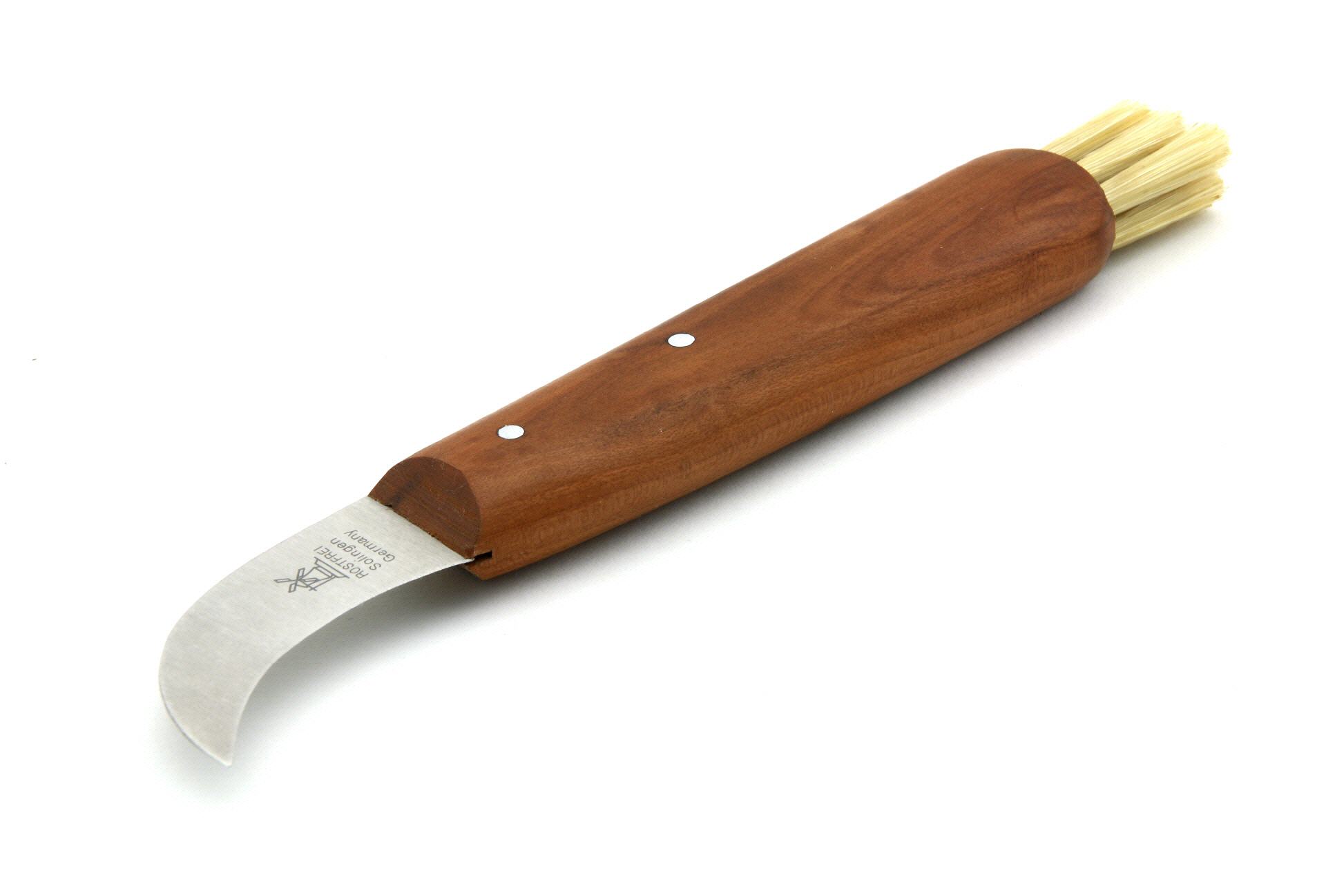 Das Pilzmesser mit der stark gebogenen Klinge und den Naturborsten ist gleichermaßen geeignet zum Pilze sammeln als auch zum Zubereiten in der Küche.