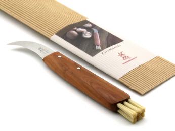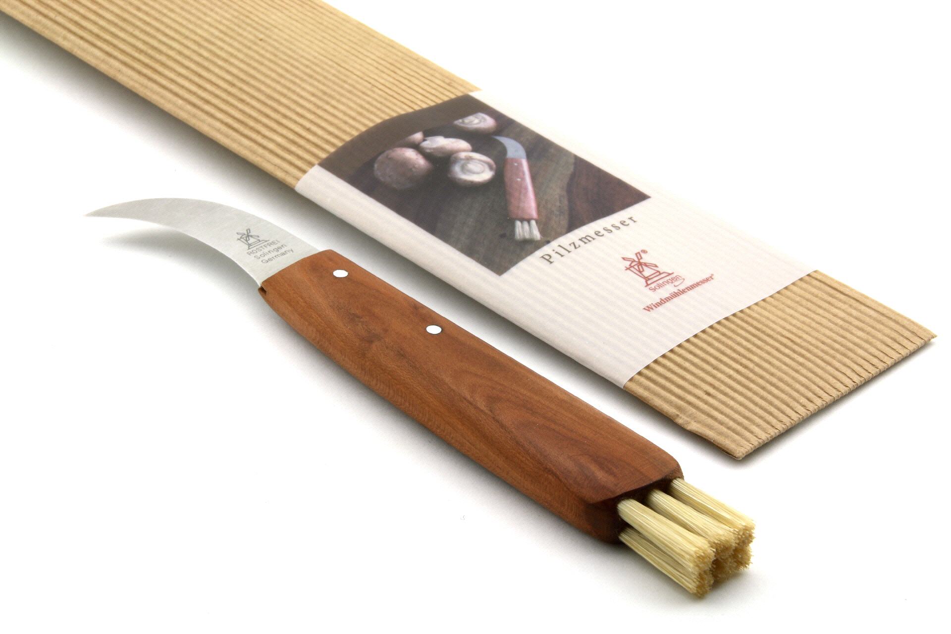 Alles, was der Pilzsammler braucht. Zum Pflücken von Pilzen benötigt man zunachst einmal ein Messer, dessen Klinge sehr stark gebogen ist, damit die empfindlichen Pilze behutsam geerntet werden konnen. Mit unserem Pilzpflückmesser kann man dann auch gleich mögliche Erdreste oder Blatter und Nadeln vom Pilz abbürsten. Im praktischen, optional erhältlichen Lederetui können Sie es immer am Gürtel tragen. Die Messerklinge ist aus rostfreiem Edelstahl, vakuum-eisgehärtet, von Hand geschliffen und gepließtet fur besondere Schärfe und Schnitthaltigkeit. Der Griff ist- wie auch bei vielen anderen Windmühlenmessern - aus hochwertigem Pflaumenholz. Bei den Borsten handelt es sich um naphtalinfreie, natürliche Schweineborsten, die von einem ökologischen Bürstenmacher in Deutschland per Hand eingezogen werden. Das Windmühlen Pilzpfluckmesser ist also ein durch und durch naturliches Werkzeug. Wenn Sie das nächste Mal auf Pilzsuche gehen: Vergessen Sie das passende Windmühlenmesser nicht.