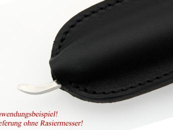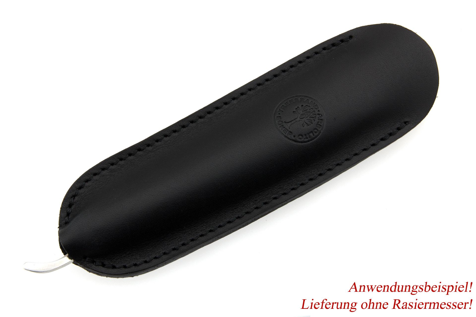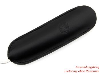 Hochwertig verarbeitetes, schwarzes Leder-Stecketui, passend für alle marktüblichen Rasiermessergrößen. Zur sicheren Aufbewahrung sowie zum Transport der Rasiermesser wird die Klingenangel durch eine vorgesehene Öffnung in der Naht des Etuis gesteckt. Lieferung ohne Rasiermesser.