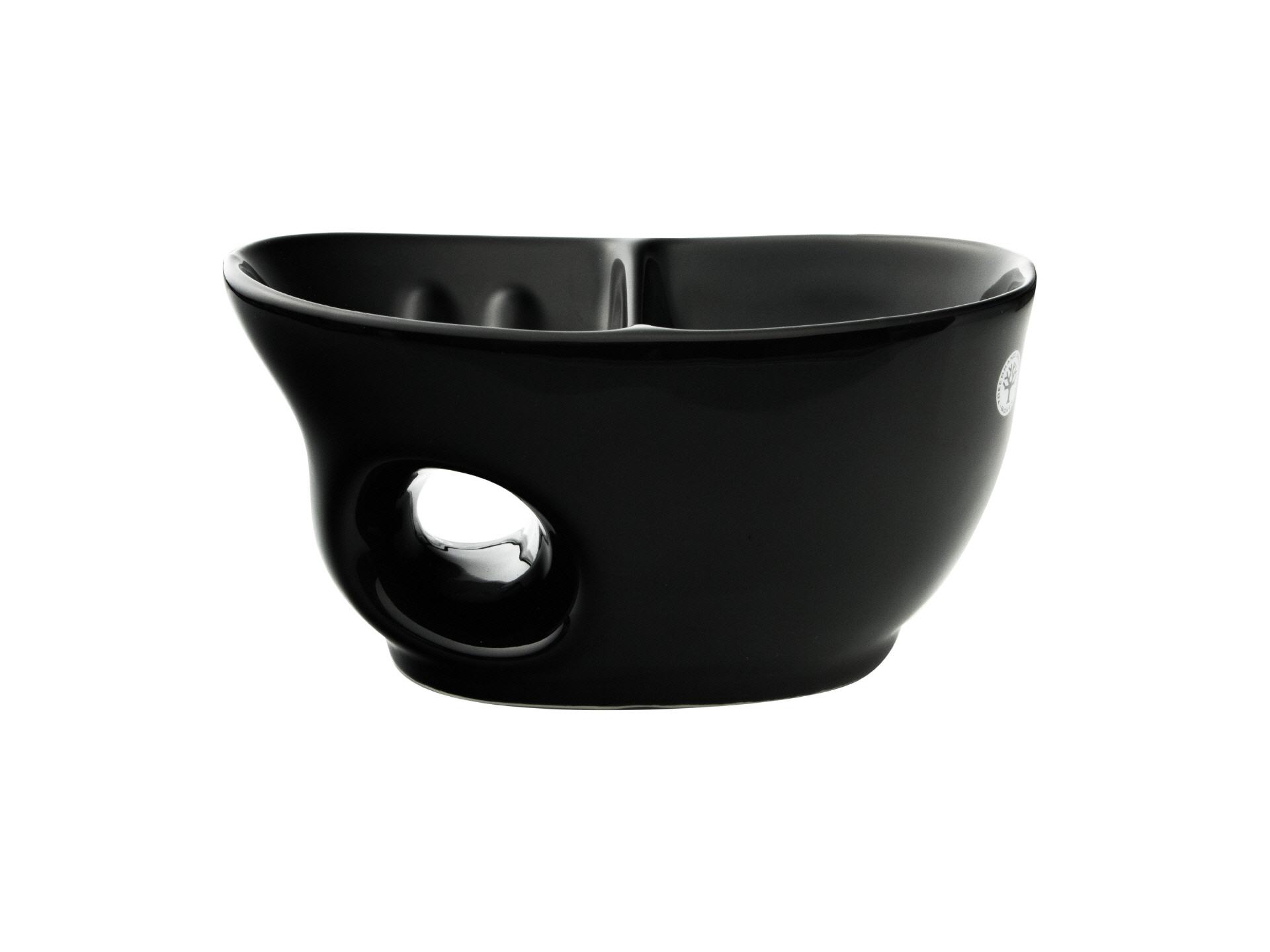 Doppelwandiger Rasiermug aus beschichteten Porzellan mit Daumenloch, der auch im nassen Zustand sicher in der Hand liegt. Die unterteilte Rasierschale eignet sich perfekt für die stilvolle Nassrasur.