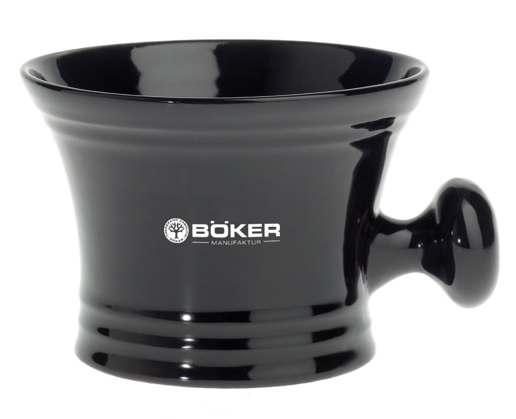 Die hochwertige Böker Rasierschale mit Henkel aus schwarzem Porzellan mit extra hohem Rand dient dazu, Rasierschaum anzurühren und anschließend zu lagern. Zum gründlichen Reinigen des Rasierpinsels kann die Schale aber natürlich auch mit sauberem Wasser befüllt werden. Sie kann Rasierseife mit einem maximalen Durchmesser von ca. 6,5 cm aufnehmen.