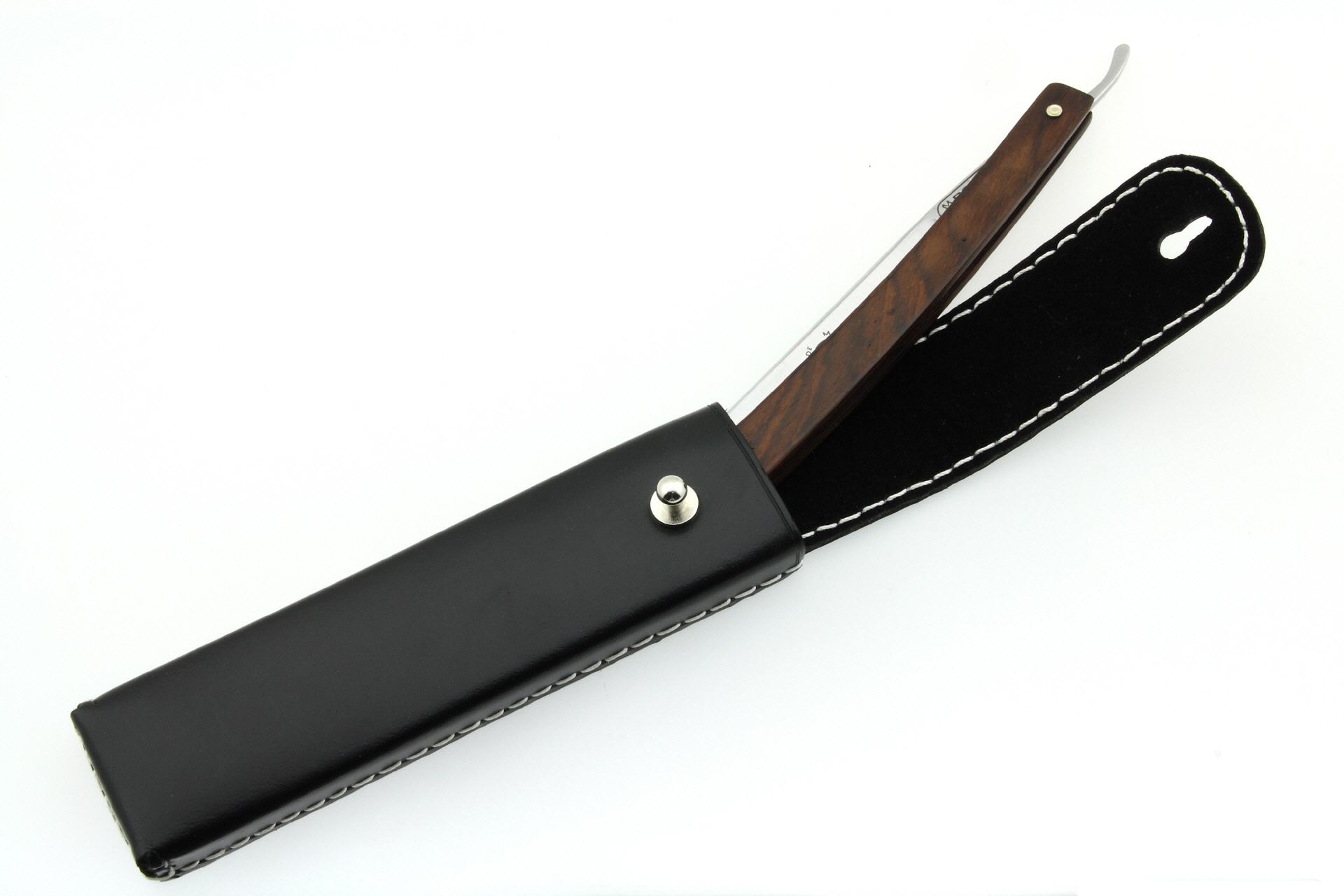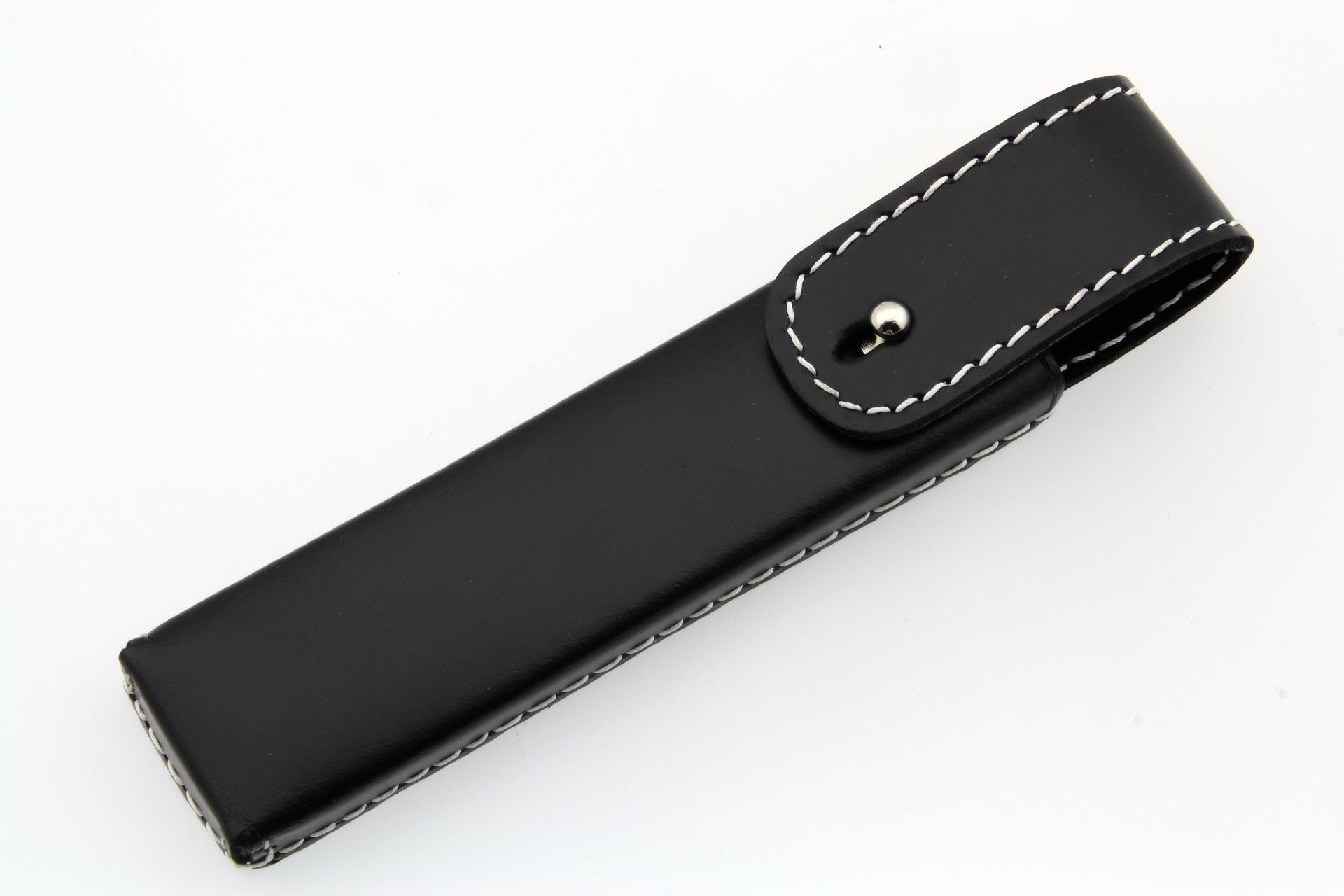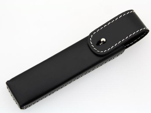 Praktisches Etui aus schwarzem Sattler-Rindleder zum Aufbewahren Ihrer hochwertigen Rasiermesser zu Hause oder unterwegs. Die Innenseite ist mit Samt ausgeschlagen.