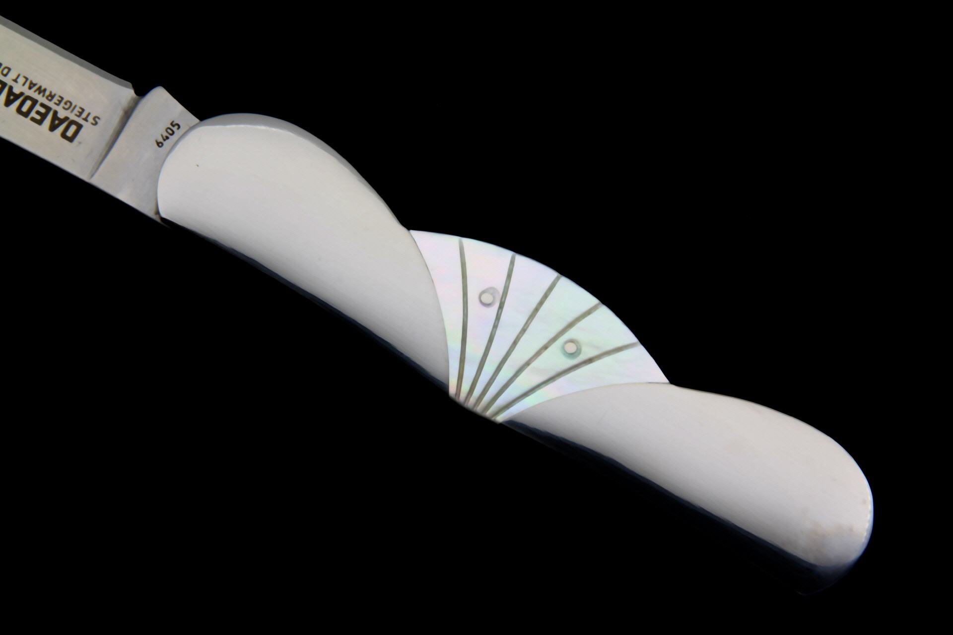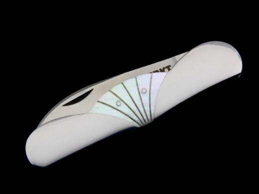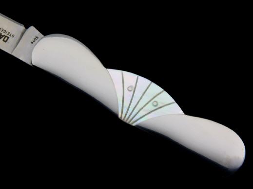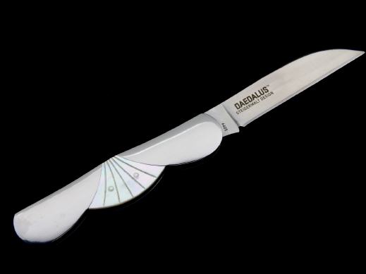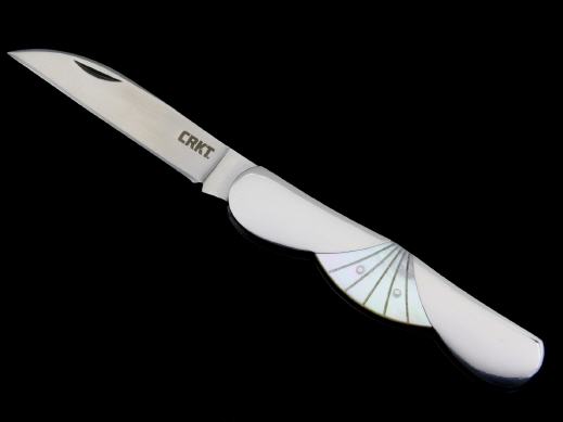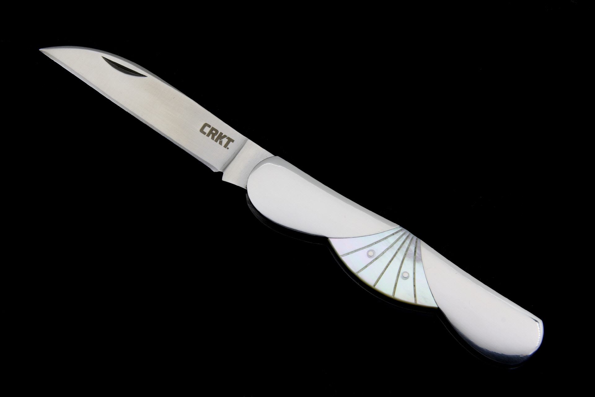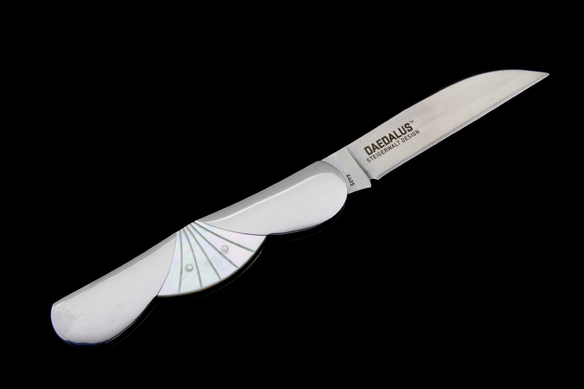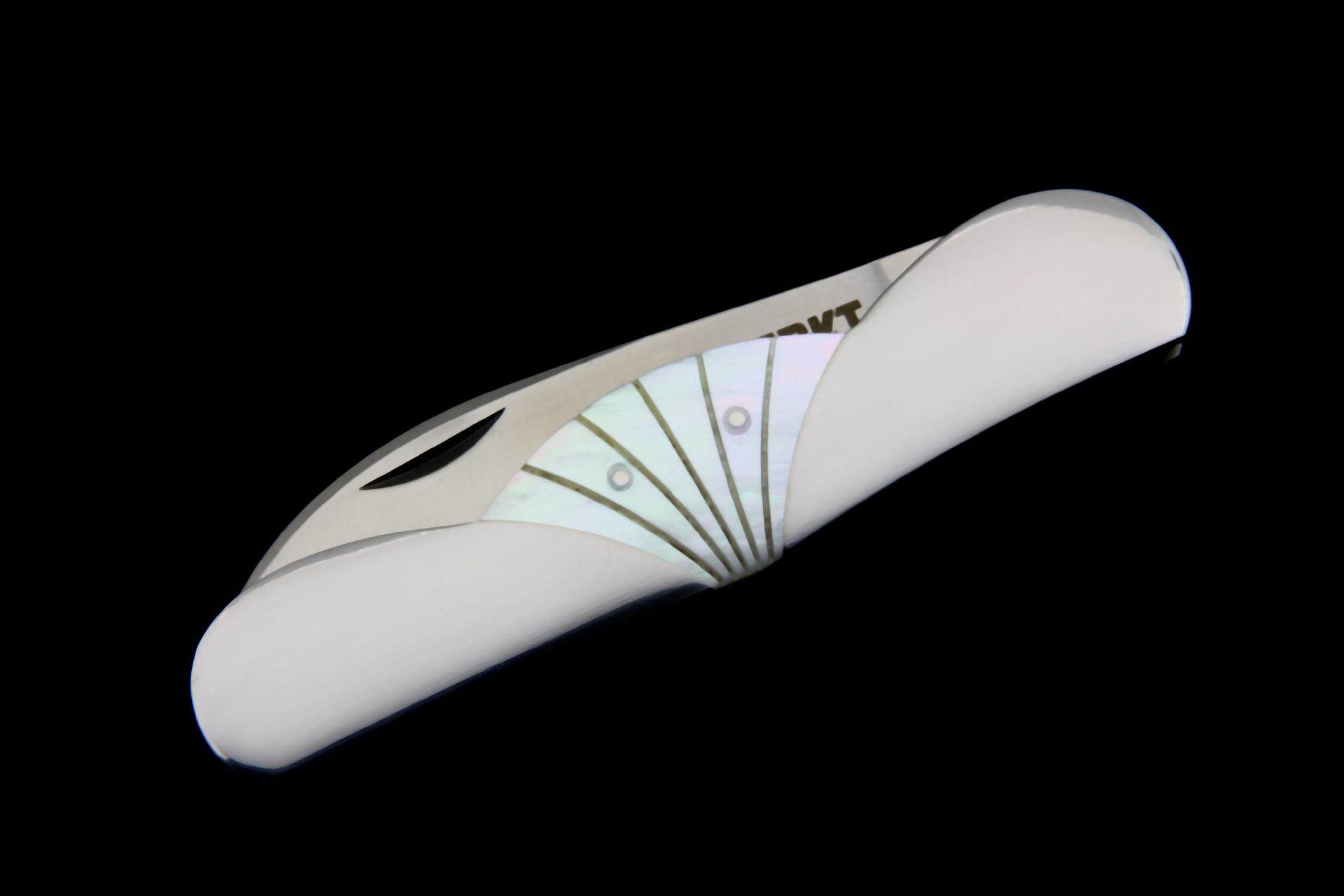 Dieses extravagante Messer besticht nicht nur durch den fein satinierten Edelstahlgriff, sondern auch durch die gefächert angeordneten Perlmutteinlagen. Die Wharncliffe-Klinge ist prädestiniert für kontrollierte, ziehende Schnitte und feine Schneidarbeiten.