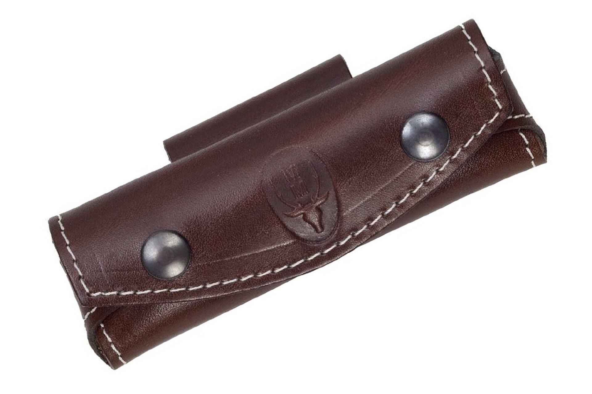 Muela Etui für Taschenmesser aus stabilem, braunem Leder, mit zwei Druckknöpfen zum Quertragen am Gürtel.