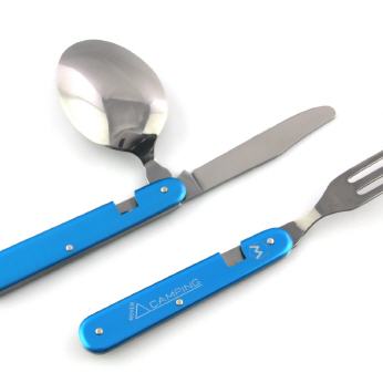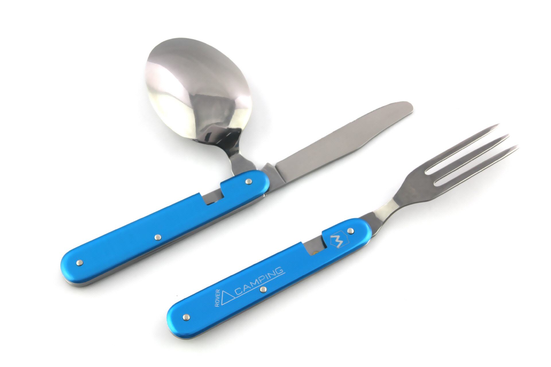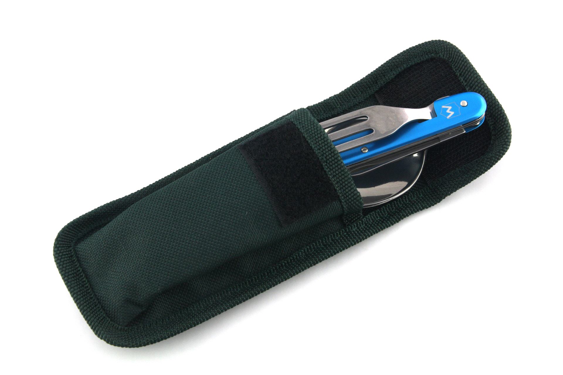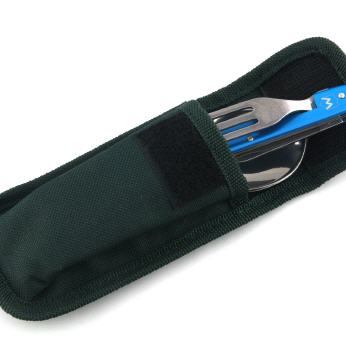 Durch Verschieben der Griffschalen lässt sich das Besteck in zwei Teile zerlegen. Ein Teil besteht aus Messer und Löffel und das zweite Teil ist die Gabel. Ein Cordura ®-Etui wird mitgeliefert.